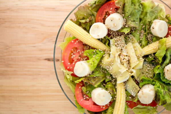 Ingredientes: Lechuga, jitomate, palmito, alcachofas, elotitos, ajonjolí y aceite de oliva. Acompañada de aderezo mil islas.
